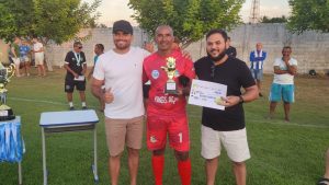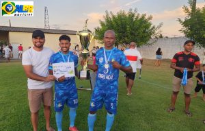 Goleiro Marcos recebeu das mãos do Secretário Gilbeon Rodrigues o troféu de melhor goleiro do campeonato  – Foto: Gyan Carlos