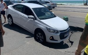 Uma cratera se abriu na manhã deste sábado (20) e deixou um carro preso em trecho da Avenida Assis Chateaubriand, na orla do bairro do Prado,