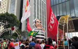 Participantes do ato “Congresso Inimigo do Povo” ergueram um boneco gigante do ex-presidente Jair Bolsonaro (PL) vestido com roupa de presidiário e cantaram “Papuda” neste domingo (14.dez.2025), na avenida Paulista, em